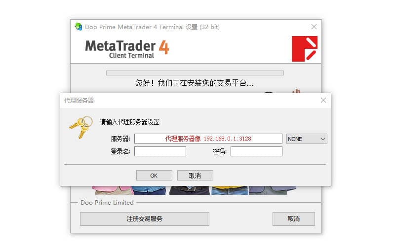 您好,安装MT软件的过程中出现像下图一样的页面,提示您输入代理服务器,而我又沒有代理服务器,只有MT账号、密码、服务器,输入之后也无法继续安装或者登录,要怎么做才能登录账户?首先,页面提示【请输入代理服务 ...