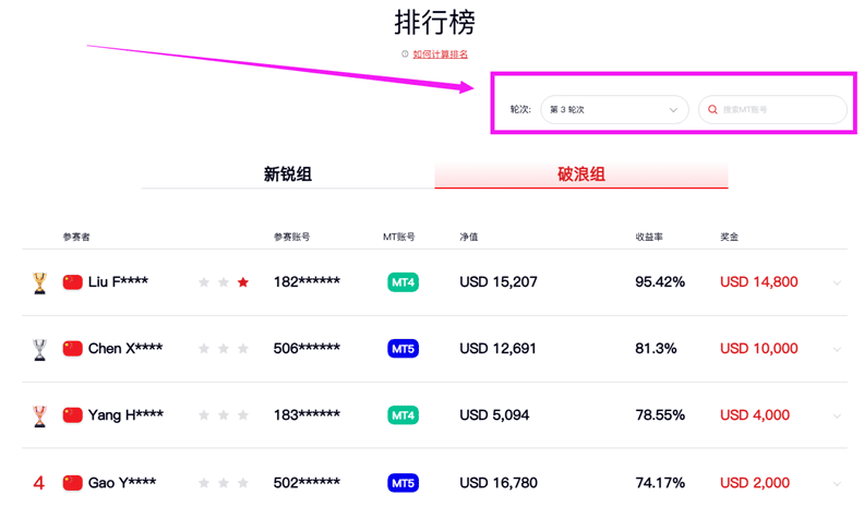 3.如查看自己排名,请选择正确【比赛轮次】→输入想查询【MT 账号】