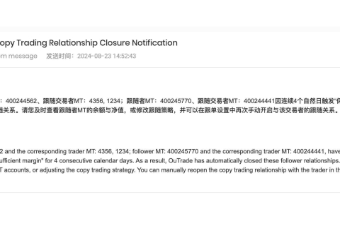 您好!为了提供更优质的社区跟单体验,Doo Prime 将于 2024 年 9 月 2 日 00:00:06(GMT + 3),上线 OuTrade 自动关闭跟单状态的功能。具体详情如下:1.当跟单者的 MT 触发关闭规则时,OuTrade 将自动关闭跟单者 ...