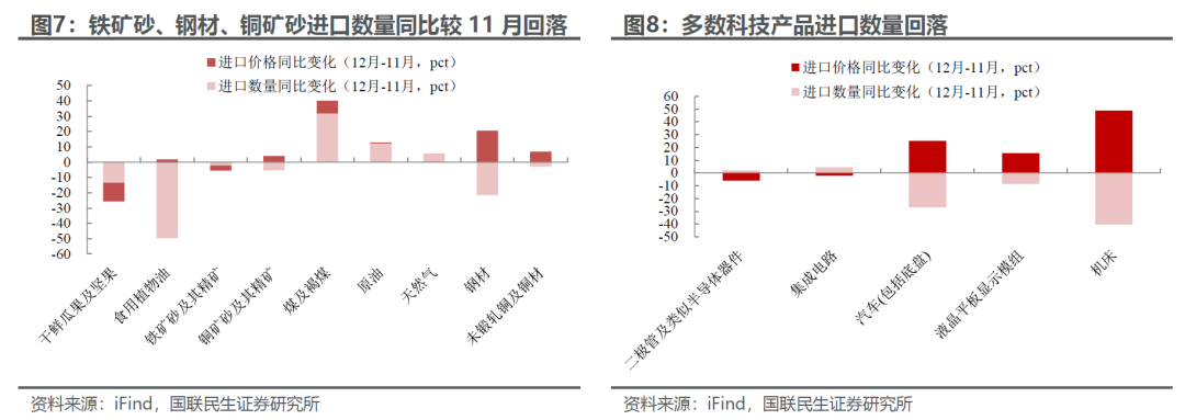 而相对出口,进口增速虽然也如期回升,但从结构上来看,内需修复的进程可能依然相对偏缓。一方面,12月进口增速同比靠前的产品主要以集成电路、高新技术产品为主,科技含量更高;另一方面,从12月主要产品进口量价拆分来看,铁矿砂、铜矿砂、钢材等多数产品较11月进口数量同比增速并未出现明显回升,反而价格是主要拉动,内需回升的基础尚不牢固。在地产、基建投资相对承压的背景下,内需修复进程仍有待政策进一步发力撬动。